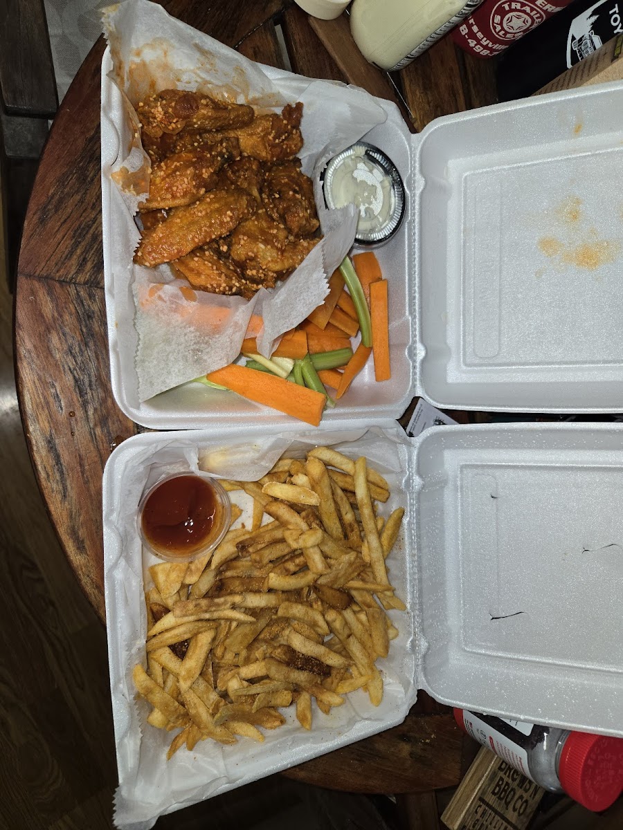 I stopped otw home from work and ordered at the bar the. Lady bar tender was friendly took my order asap, and offered me a drink while I waited, as they're open a tad later then most places during the week, I ordered a 10 piece wing but came with veggies and ranch - i believe the total after tax was 18$ which I think is fair they're decent sized, and the skin was still crispy after sauced which was a big bonus for me The ranch very good/ decent imo, you can tell it's housemade However my " complaints " - it's a tad thin I like a thicker ranch usually and this could use some more mayo - maybe a tad bit more on the garlic too (but that's just me I can see someone who doesn't enjoy garlic as much love this ranch I've seen several reviews for ksr and whoever did recommend them deserves a cold pillow all night and their ate